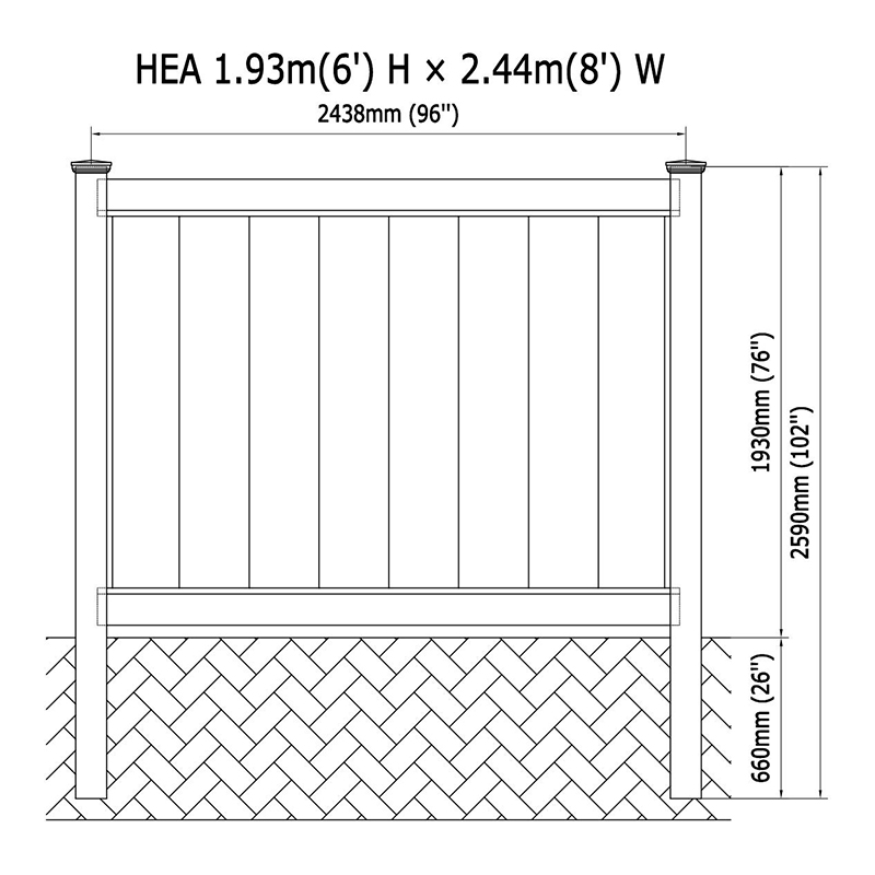 Ogrodzenie jest zbudowane tak, jak trwałe posty dostępne w 4 „x 4” lub 5 "x 5", z opcjonalnymi wysokościami do 102 cali. Każdy post jest wstępnie wykonany w celu łatwej instalacji, zaprojektowany do konfiguracji linii, końca, narożnika, 3-kierunkowej lub pustej. Dolne i górne szyny są zbudowane ze solidnych kawałków 2 x 6 "x 94", wstępnie nagradzanych dla wygody. Aluminiowa wkładka w dolnej szynie zwiększa jego wytrzymałość, zapewniając trwałość klasy komercyjnej.
